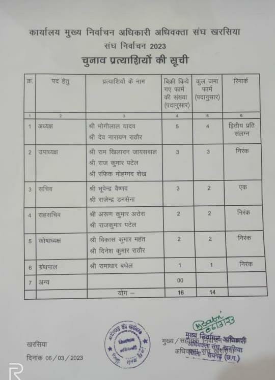 खरसिया अधिवक्ता संघ चुनाव -अध्यक्ष-2,उपाध्यक्ष-3,सचिव-2,सह सचिव-2,कोषाध्यक्ष-2,ग्रंथपाल-1 अधिवक्ता ने भरा नामंकन फॉर्म 17 मार्च को होना है चुनाव,…