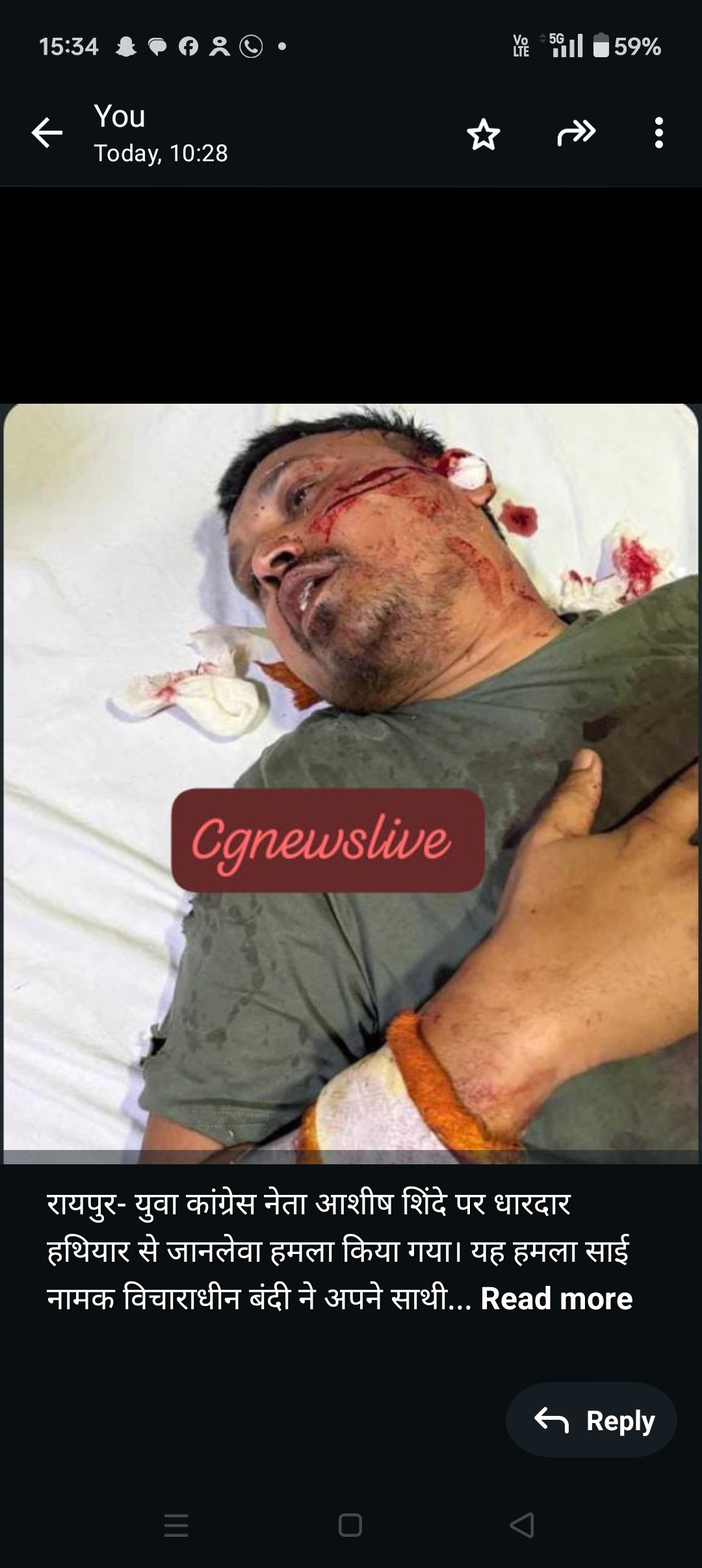 रायपुर- युवा कांग्रेस नेता आशीष शिंदे पर धारदार हथियार से जानलेवा हमला किया गया। यह हमला साई नामक विचाराधीन बंदी ने अपने साथी के साथ मिलकर किया।