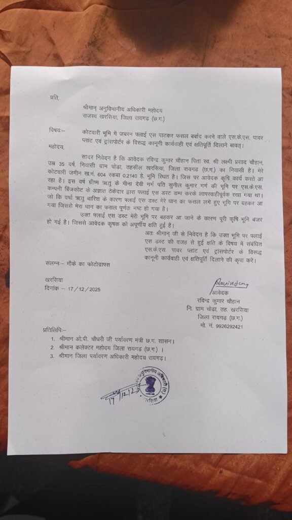 ऐसा हीं ताज़ा मामला खरसिया तहसील से लगे ग्राम चोड़ा का है जहाँ कोटवारी भूमि पर जिसका खसरा नंबर 604 है जिसका रकबा 0.2140 हेक्टेयर है। फ़सल बर्बाद होने की लिखित शिकायत दिनांक 17/22/25 को कोटवार रविंद्र चौहान ने खरसिया एसडीएम कार्यालय पहुंच के किया है। उक्त शिकायत की प्रतिलिपि पर्यावरण मंत्री ओपी चौधरी, जिला कलेक्टर रायगढ़ एवं जिला पर्यावरण अधिकारी को भी प्रेषित किया है। शिकायत मे दोषी प्लांट प्रबंधन के विरुद्ध एवं संबंधित ठेकेदार के विरुद्ध कार्यवाही की मांग करते हुये फ़सल नुकसानी दिलाये जाने की बात कही है।