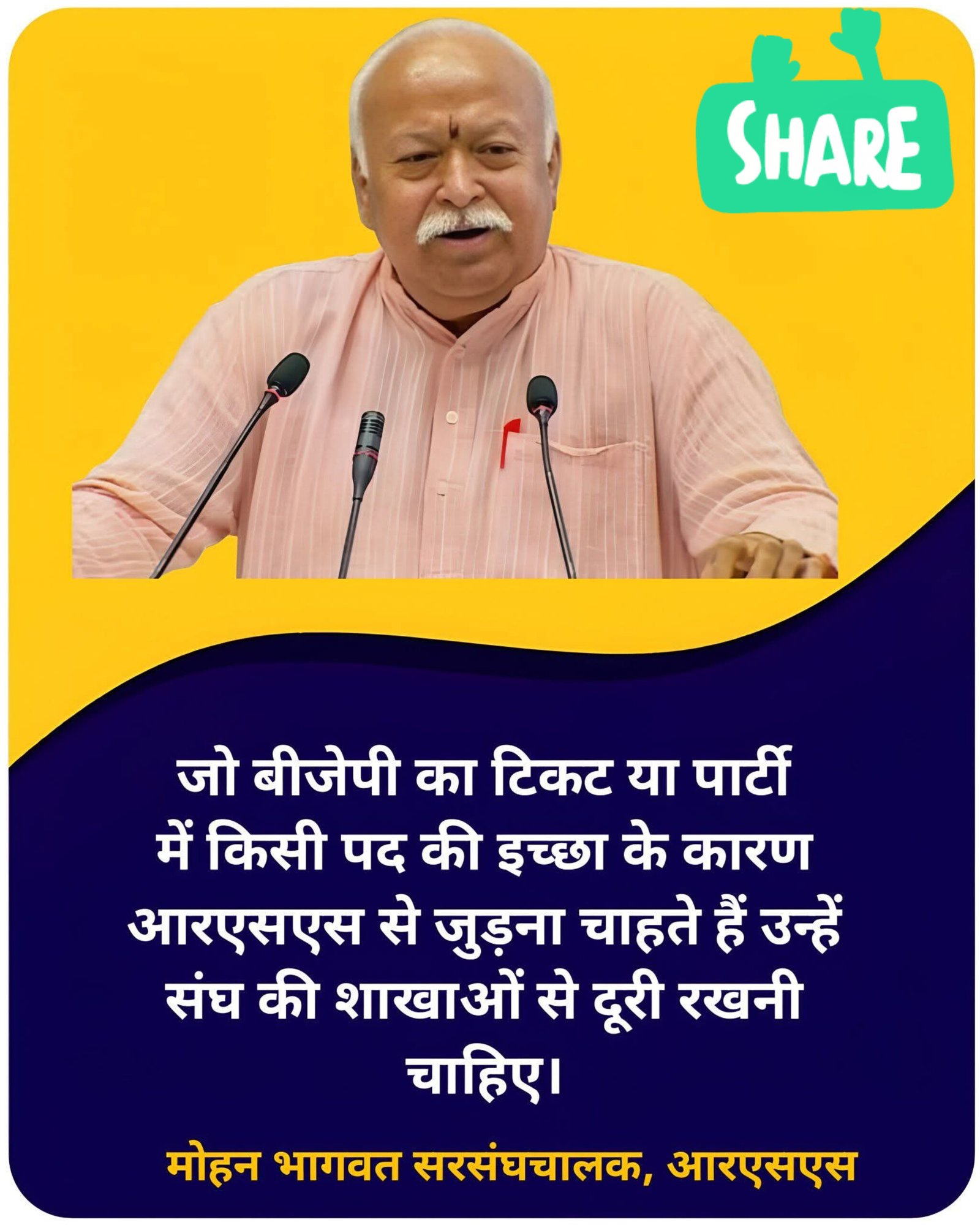 बीजेपी का टिकट या पार्टी में किसी पद की इच्छा के कारण आरएसएस से जुड़ना चाहते हैं, उन्हें संघ की शाखाओं से दूरी रखनी चाहिए….. आखिर क्यों कहा संघ प्रमुख ने पढ़े पूरी खबर…
