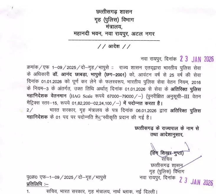 2001 बैच: डॉ. आनंद छाबड़ा बने अतिरिक्त पुलिस महानिदेशक Also Read – शादी का झांसा देकर विधवा महिला से दुष्कर्म का प्रयास, आरोपी गिरफ़्तार राज्य कैडर के वरिष्ठ आईपीएस अधिकारी डॉ. आनंद छाबड़ा (भापुसे–2001) को 25 वर्ष की सेवा पूर्ण करने के उपरांत अतिरिक्त पुलिस महानिदेशक (एडीजी) के पद पर पदोन्नत किया गया है। इस संबंध में भारत सरकार के गृह मंत्रालय से 6 जनवरी 2026 को स्वीकृति प्राप्त हुई थी। डॉ. आनंद छाबड़ा को एक अनुभवी और प्रशासनिक दृष्टि से सक्षम अधिकारी माना जाता है। उनकी पदोन्नति से राज्य पुलिस बल को नीति निर्धारण और रणनीतिक संचालन में मजबूती मिलने की उम्मीद है।