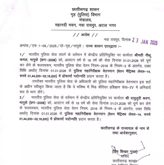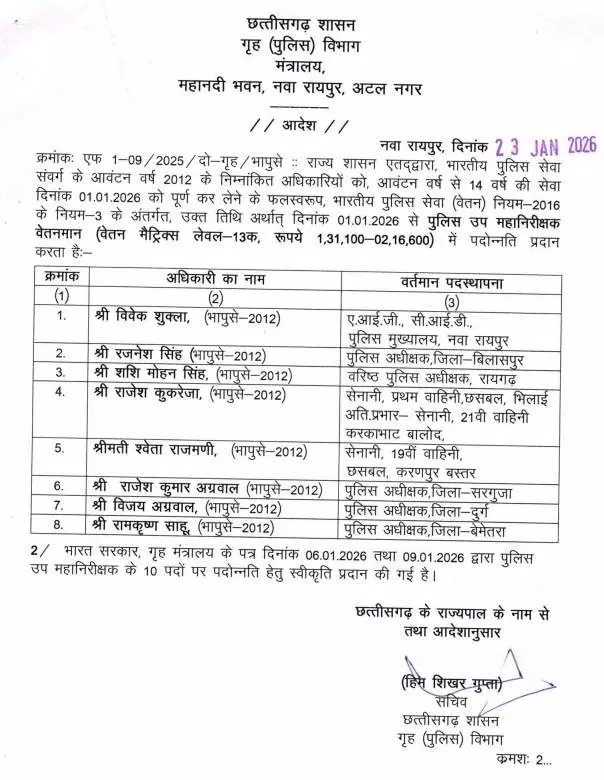 Raipur. रायपुर। छत्तीसगढ़ शासन के गृह (पुलिस) विभाग ने भारतीय पुलिस सेवा (आईपीएस) के अधिकारियों की पदोन्नति को लेकर महत्वपूर्ण आदेश जारी किया है। इस आदेश के तहत विभिन्न बैच के आईपीएस अधिकारियों को उनकी सेवा अवधि और पात्रता के आधार पर उच्च पदों पर पदोन्नत किया गया है। यह निर्णय राज्य पुलिस प्रशासन में अनुभव और नेतृत्व को और मजबूत करने की दिशा में अहम माना जा रहा है।