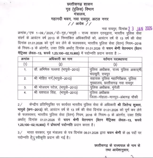 इन पदोन्नतियों के लिए भारत सरकार के गृह मंत्रालय द्वारा 6 जनवरी एवं 9 जनवरी 2026 को स्वीकृति प्रदान की गई थी। इन अधिकारियों की पदोन्नति से जिला और रेंज स्तर पर पुलिस प्रशासन को और अधिक मजबूती मिलने की संभावना है। 2013 बैच: चार अधिकारियों को चयन श्रेणी में पदोन्नति आवंटन वर्ष 2013 के आईपीएस अधिकारियों- डॉ. अभिषेक पल्लव, मोहित गर्ग, भोजराम पटेल और यशपाल सिंह—को चयन श्रेणी में पदोन्नत किया गया है। इसके अतिरिक्त केंद्रीय प्रतिनियुक्ति पर कार्यरत आईपीएस अधिकारी जितेंद्र शुक्ला (भापुसे–2013) को भी चयन श्रेणी में प्रोफार्मा पदोन्नति प्रदान की गई है।