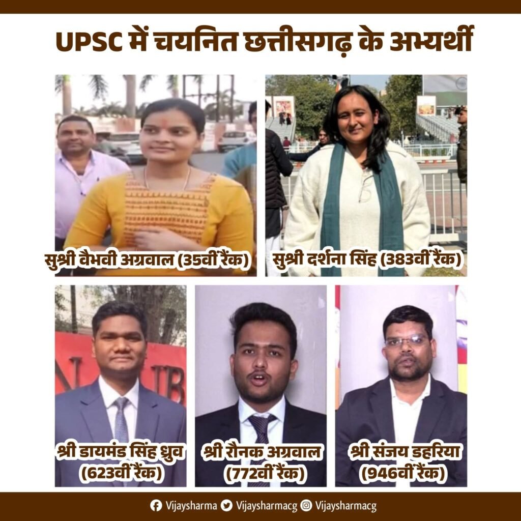 Vaibhavi Agrawal (रायपुर) ने 35वीं रैंक, Darshana Singh (मनेंद्रगढ़-चिरमिरी-भरतपुर) ने 383वीं रैंक, Diamond Singh Dhruv (डीएसपी, धमतरी) ने 623वीं रैंक, Raunak Agrawal (रायपुर) ने 772वीं रैंक तथा Sanjay Dahariya (महासमुंद) ने 946वीं रैंक हासिल कर उल्लेखनीय सफलता प्राप्त की है।