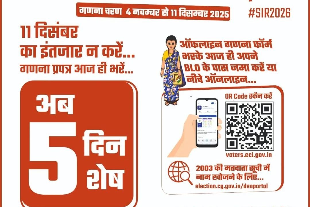 #SIR2026 अंतिम 5 दिवस शेष गणना प्रपत्र भरने की अंतिम तिथि 11 दिसम्बर 2025 है।