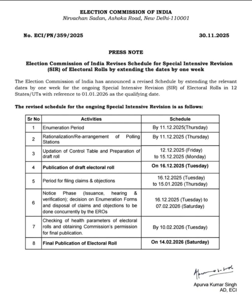आवश्यक सूचना विशेष गहन पुनरीक्षण (SIR) 2026 की समय-सारणी संशोधित — भारत निर्वाचन आयोग ने सभी प्रमुख तिथियों में एक...