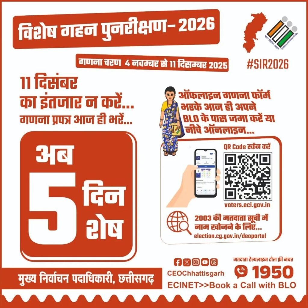 #SIR2026 अंतिम 5 दिवस शेष गणना प्रपत्र भरने की अंतिम तिथि 11 दिसम्बर 2025 है।